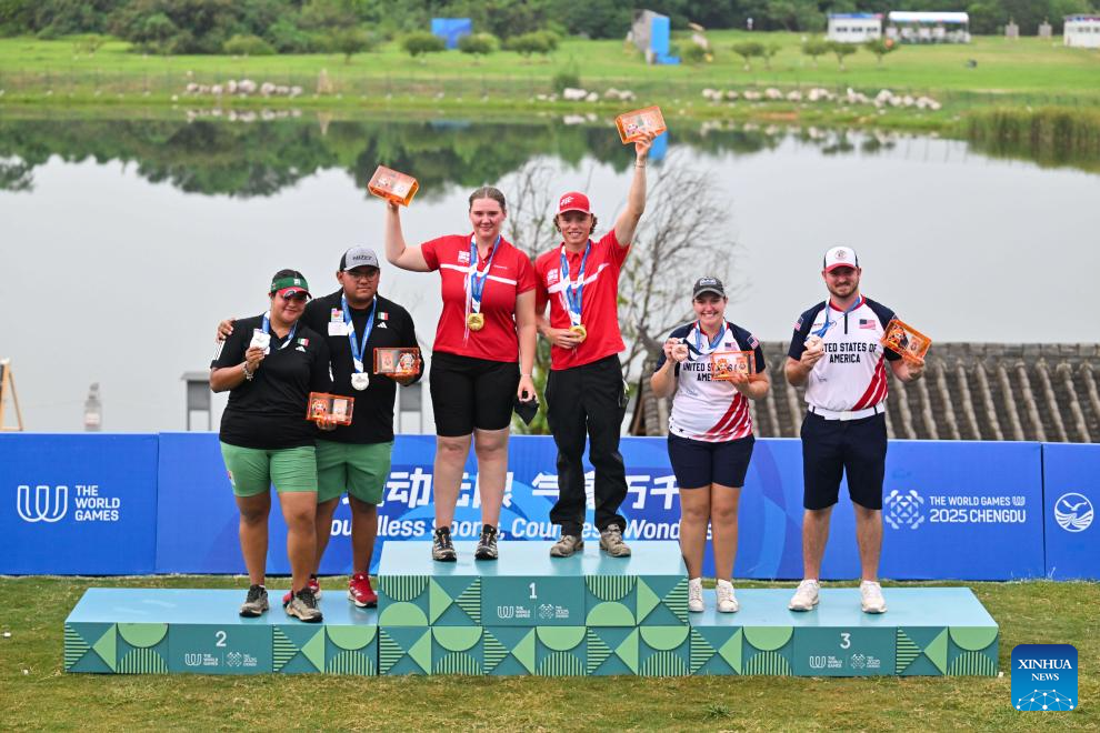 CHENGDU, 8 agosto, 2025 (Xinhua) -- Los medallistas de oro Mathias Bertrand Fullerton (3-d)/Sofie Louise Dam Marcussen (3-i), de Dinamarca, los medallistas de plata Sebastián García Flores (2-i)/Andrea Maya Becerra Arizaga (i), de México, y los medallistas de bronce Alexis Mercedes Ruiz (2-d)/Curtis Lee Broadnax, de Estados Unidos, son vistos durante la ceremonia de premiación del encuentro de compuesto por equipos mixtos del evento de tiro con arco en los Juegos Mundiales 2025, en Chengdu, en la provincia de Sichuan, en el suroeste de China, el 8 de agosto de 2025. (Xinhua/Yang Wenbin)