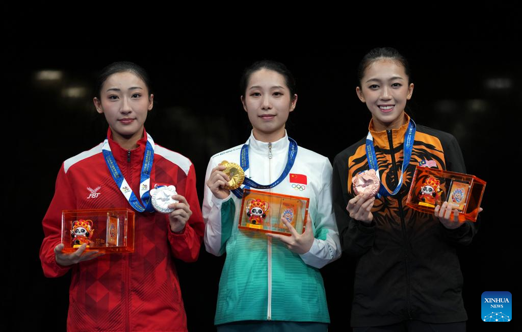 CHENGDU, 8 agosto, 2025 (Xinhua) -- La medallista de oro Lu Zhuoling (c), de China, la medallista de plata Zeanne Law (i), de Singapur, y la medallista de bronce Chin Sy Xuan Sydney, de Malasia, posan durante la ceremonia de premiación de la final de Taijiquan-Taijijian femenino del evento de wushu en los Juegos Mundiales 2025, en Chengdu, en la provincia de Sichuan, en el suroeste de China, el 8 de agosto de 2025. (Xinhua/Xu Suhui)