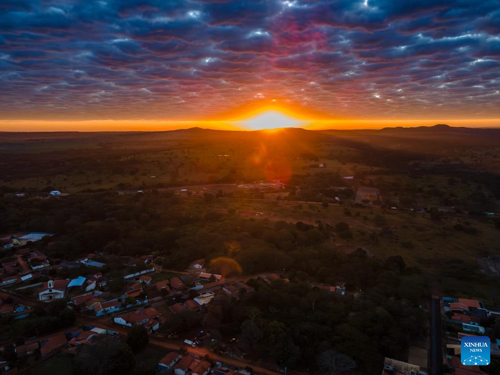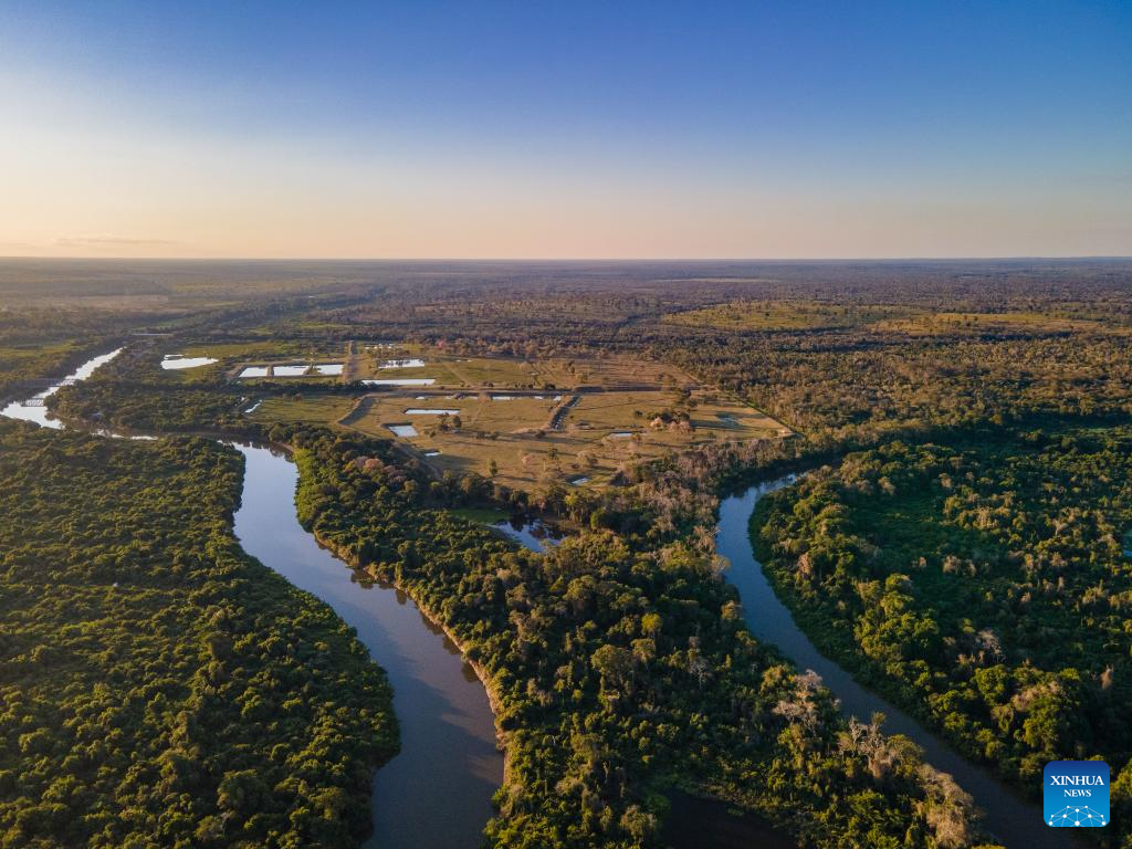 MATO GROSSO DO SUL, 9 agosto, 2025 (Xinhua) -- Vista aérea tomada con un dron el 7 de agosto de 2025 del amanecer en el Pantanal Sur, en la ciudad de Miranda, en el estado de Mato Grosso do Sul, Brasil. (Xinhua/Paulo Lopes)