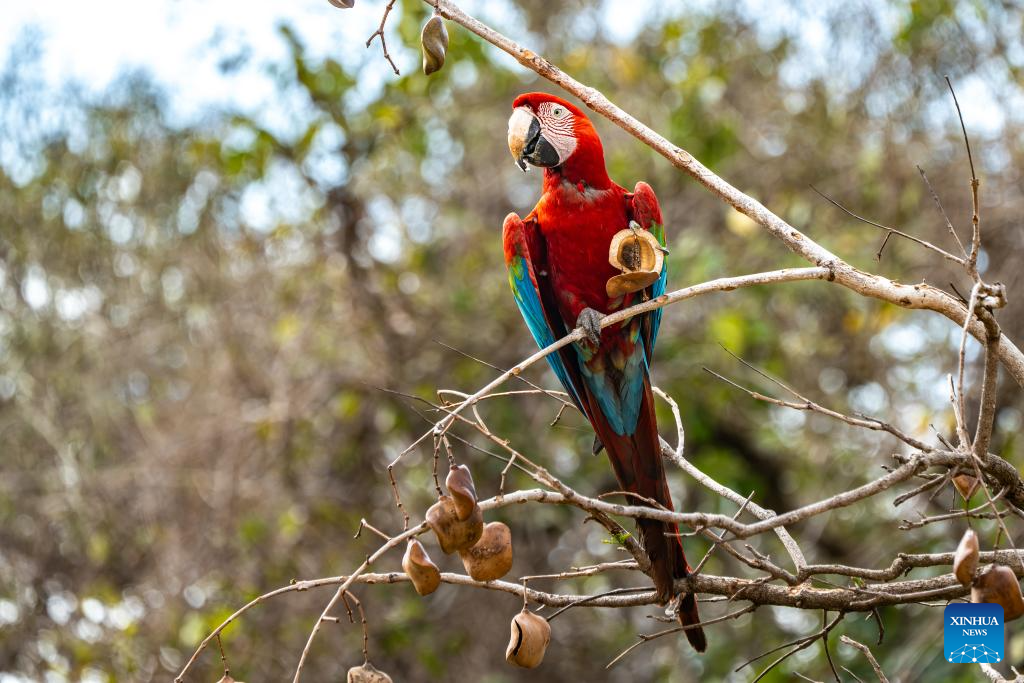 MATO GROSSO DO SUL, 9 agosto, 2025 (Xinhua) -- Imagen del 7 de agosto de 2025 de una guacamaya roja alimentándose sobre una rama de un árbol, en el Pantanal Sur, en la ciudad de Miranda, en el estado de Mato Grosso do Sul, Brasil. (Xinhua/Paulo Lopes)