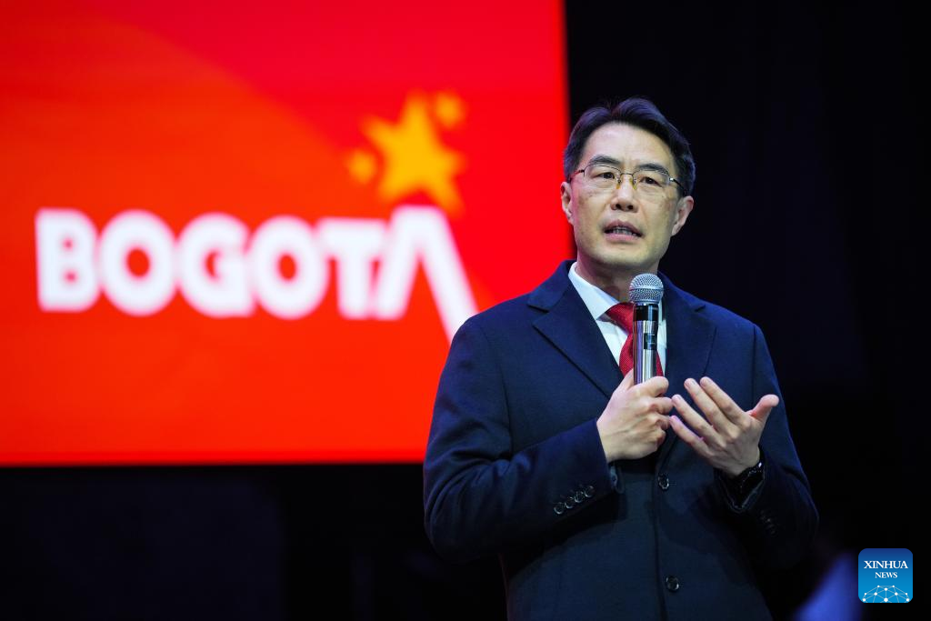 BOGOTA, 9 agosto, 2025 (Xinhua) -- Imagen del 8 de agosto de 2025 del embajador de China en Colombia, Zhu Jingyang, hablando durante la Noche China en el marco del Festival de Verano de Bogotá, en el Parque Metropolitano Simón Bolívar, en la ciudad de Bogotá, capital de Colombia. La capital de Colombia, Bogotá, vivió la noche del viernes la Noche China, en la que los ciudadanos disfrutaron de diversas actividades en torno a la cultura y tradiciones del país asiático. (Xinhua/Andrés Moreno)