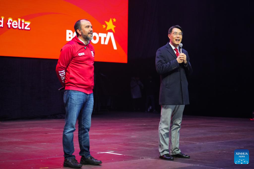 Imagen del 8 de agosto de 2025 del director del Instituto Distrital de Recreación y Deporte, Daniel García (i), y el embajador de China en Colombia, Zhu Jingyang (d), participando durante la Noche China en el marco del Festival de Verano de Bogotá, en el Parque Metropolitano Simón Bolívar, en la ciudad de Bogotá, capital de Colombia. La capital de Colombia, Bogotá, vivió la noche del viernes la Noche China, en la que los ciudadanos disfrutaron de diversas actividades en torno a la cultura y tradiciones del país asiático. (Xinhua/Andrés Moreno)