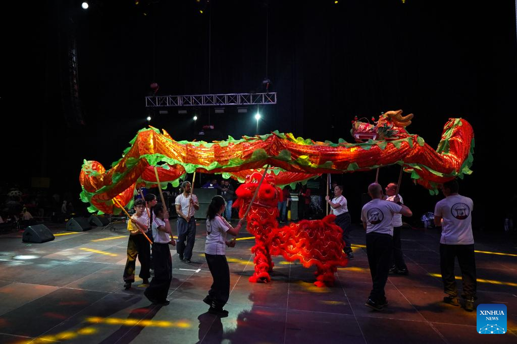 BOGOTA, 9 agosto, 2025 (Xinhua) -- Imagen del 8 de agosto de 2025 de artistas realizando la danza del dragón durante la Noche China en el marco del Festival de Verano de Bogotá, en el Parque Metropolitano Simón Bolívar, en la ciudad de Bogotá, capital de Colombia. La capital de Colombia, Bogotá, vivió la noche del viernes la Noche China, en la que los ciudadanos disfrutaron de diversas actividades en torno a la cultura y tradiciones del país asiático. (Xinhua/Andrés Moreno)
