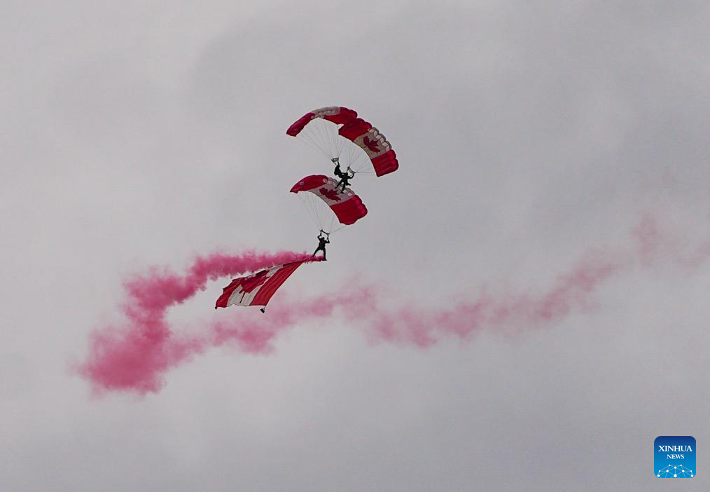 ABBOTSFORD, 9 agosto, 2025 (Xinhua) -- Imagen del 8 de agosto de 2025 de miembros del equipo de paracaidistas de las Fuerzas Armadas Canadienses, los SkyHawks, realizando una presentación durante el Espectáculo Aéreo Internacional de Abbotsford 2025, en Abbotsford, Columbia Británica, Canadá. El espectáculo aéreo de tres días, uno de los más grandes de su tipo en Norteamérica, comenzó aquí el viernes. (Xinhua/Liang Sen)