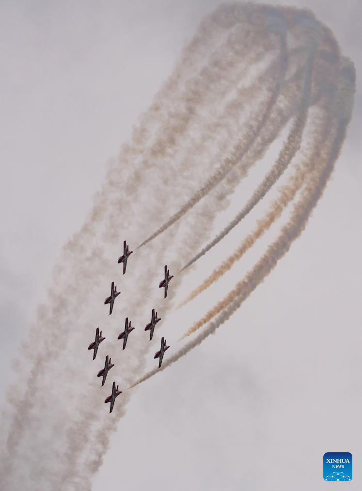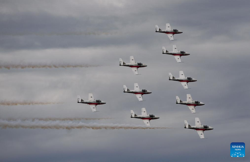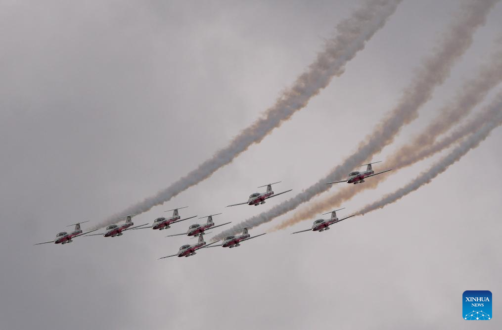 ABBOTSFORD, 9 agosto, 2025 (Xinhua) -- Imagen del 8 de agosto de 2025 de los Snowbirds de las Fuerzas Canadienses realizando una presentación durante el Espectáculo Aéreo Internacional de Abbotsford 2025, en Abbotsford, Columbia Británica, Canadá. El espectáculo aéreo de tres días, uno de los más grandes de su tipo en Norteamérica, comenzó aquí el viernes. (Xinhua/Liang Sen)