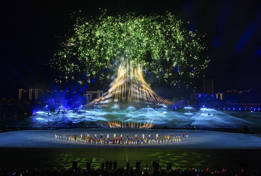 Uno de los momentos más deslumbrantes de la ceremonia inaugural del jueves fue el espectáculo de fuegos artificiales del "Árbol de la Amistad", inspirado en las antiguas reliquias de raíces de árboles desenterradas en el yacimiento Jinsha de Chengdu y en el árbol paloma, originario de Sichuan. El diseño simbolizaba la paz, el progreso y la amistad.