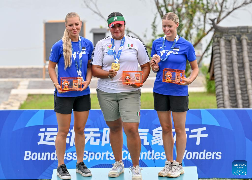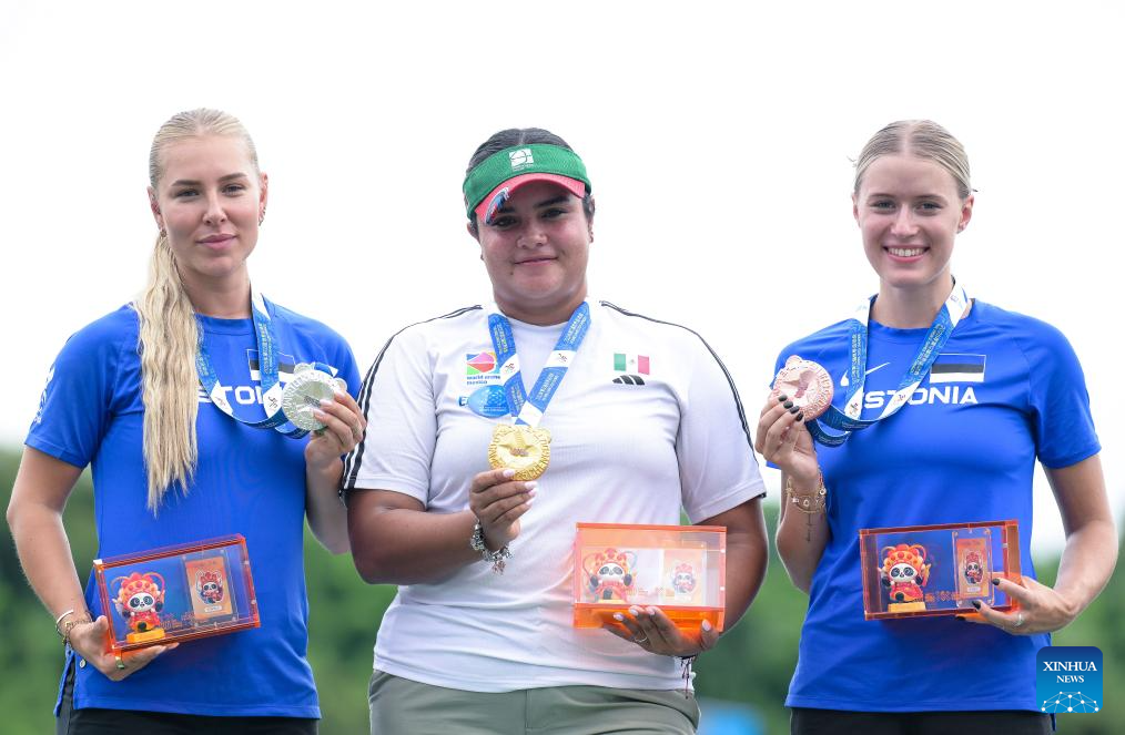 CHENGDU, 9 agosto, 2025 (Xinhua) -- La medallista de oro Andrea Maya Becerra Arizaga (c), de México, la medallista de plata Lisell Jaatma (i) y la medallista de bronce Meeri-Marita Paas, de Estonia, posan durante la ceremonia de victoria de la competencia de compuesto femenino en el evento de tiro con arco en los Juegos Mundiales 2025, en Chengdu, en la provincia de Sichuan, en el suroeste de China, el 9 de agosto de 2025. (Xinhua/Chen Cheng)