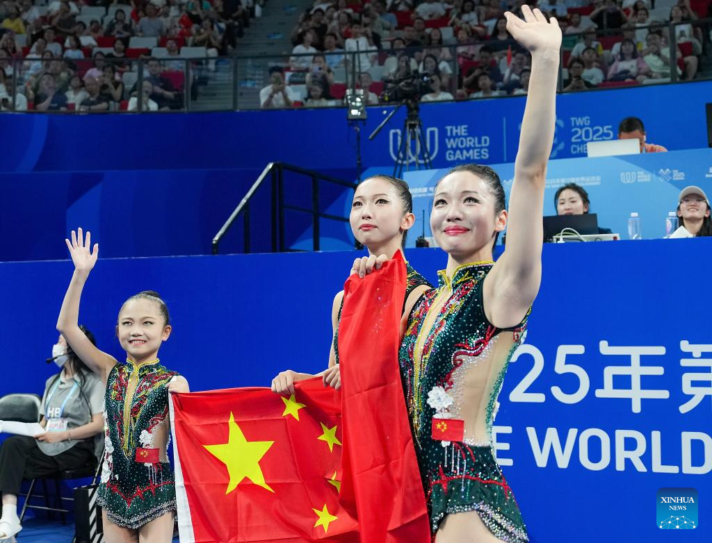 CHENGDU, 9 agosto, 2025 (Xinhua) -- (De izq. a der.) Gu Quanjia, Ding Wenyan y Ma Yixing, de China, saludan al público al término de la final de grupos femeninos del evento de gimnasia acrobática en los Juegos Mundiales 2025, en Chengdu, en la provincia de Sichuan, en el suroeste de China, el 9 de agosto de 2025. (Xinhua/Wang Xi)