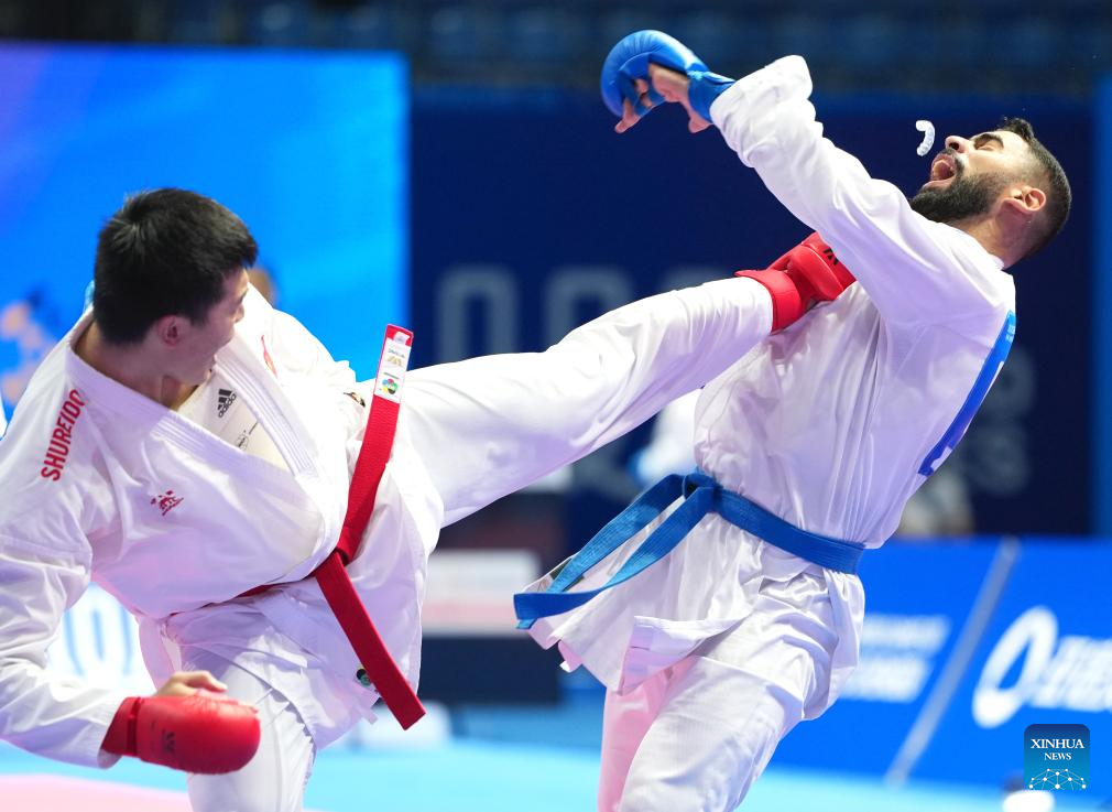 CHENGDU, 9 agosto, 2025 (Xinhua) -- Zhai Ang (i), de China, compite ante Taha Mahmoud, de Egipto, durante el combate de la fase de grupos de +84 kg de kumite masculino del evento de karate en los Juegos Mundiales 2025, en Chengdu, en la provincia de Sichuan, en el suroeste de China, el 9 de agosto de 2025. (Xinhua/Jiang Hongjing)