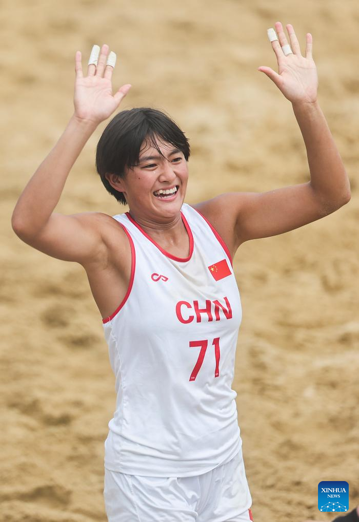CHENGDU, 9 agosto, 2025 (Xinhua) -- Zan Hui, de China, festeja durante el partido del grupo B de la ronda preliminar femenina de balonmano de playa entre Argentina y China en los Juegos Mundiales 2025, en Chengdu, en la provincia de Sichuan, en el suroeste de China, el 9 de agosto de 2025. (Xinhua/Liu Kun)