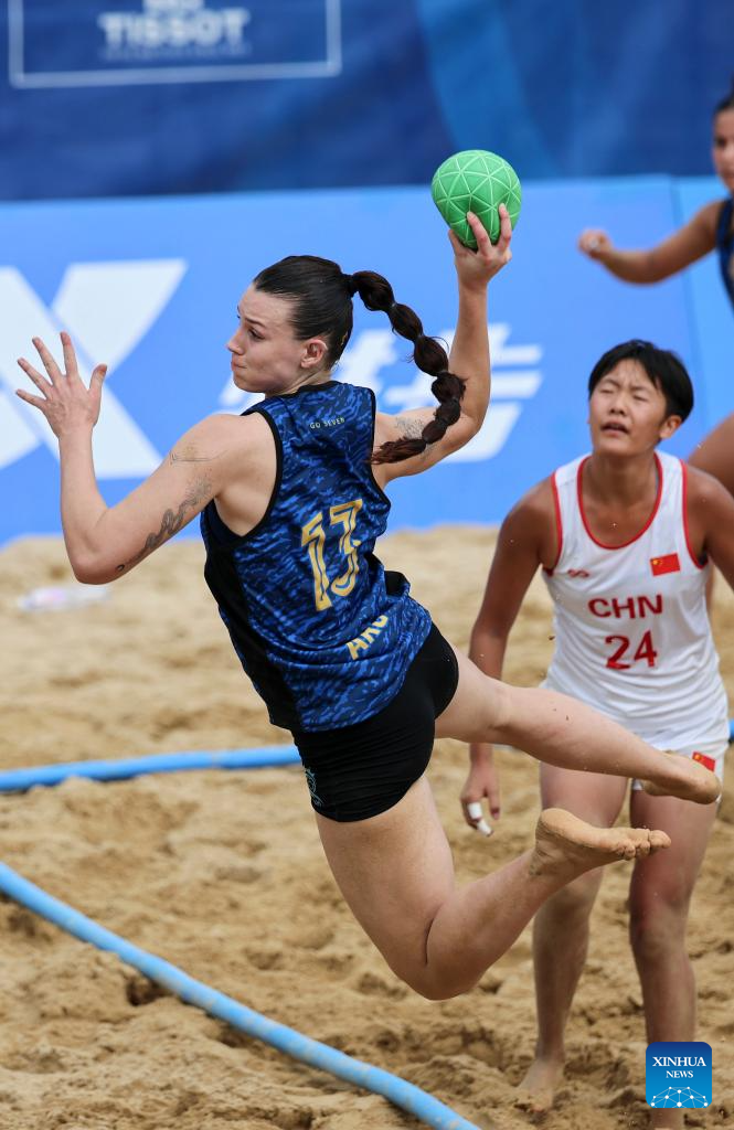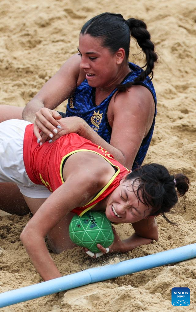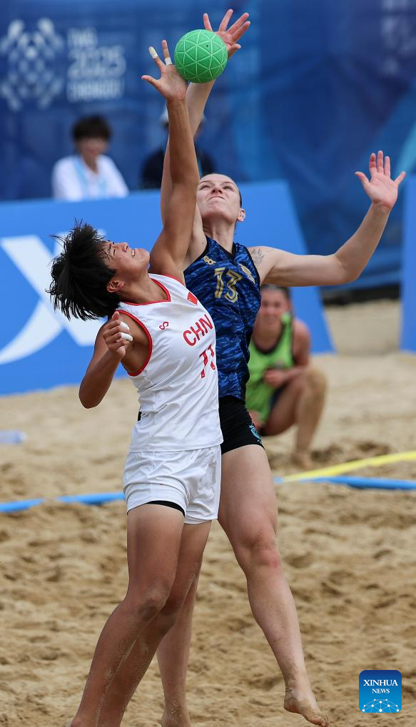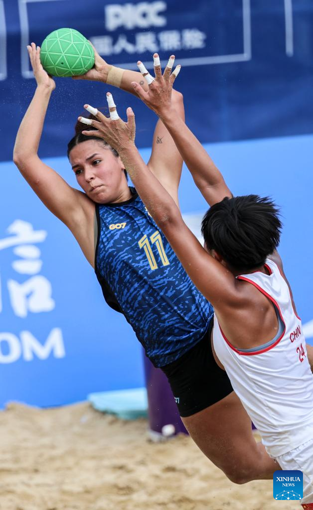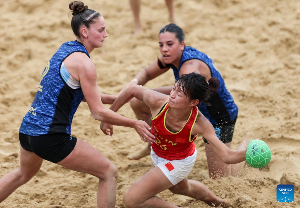 CHENGDU, 9 agosto, 2025 (Xinhua) -- Dong Xiaoyu (d-frente), de China, compite durante el partido del grupo B de la ronda preliminar femenina de balonmano de playa entre Argentina y China en los Juegos Mundiales 2025, en Chengdu, en la provincia de Sichuan, en el suroeste de China, el 9 de agosto de 2025. (Xinhua/Liu Kun)