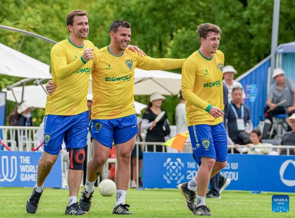 CHENGDU, 9 agosto, 2025 (Xinhua) -- Jugadores de Brasil festejan durante el partido del grupo A de la ronda preliminar masculina del evento de fistball entre Alemania y Brasil en los Juegos Mundiales 2025, en Chengdu, en la provincia de Sichuan, en el suroeste de China, el 9 de agosto de 2025. (Xinhua/Tenzin Nyida)