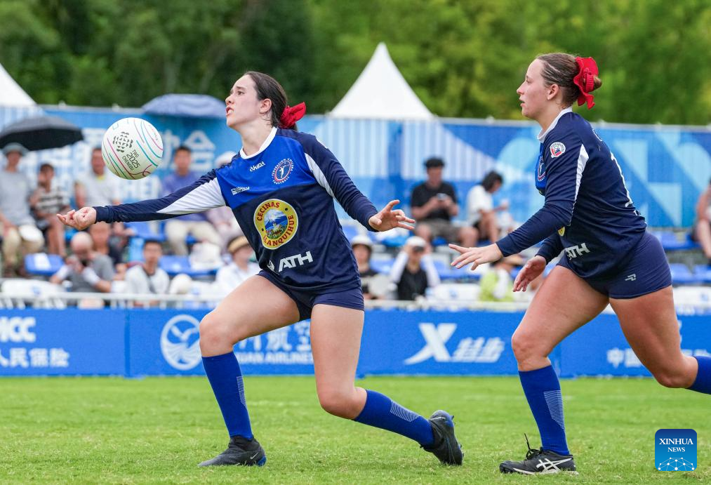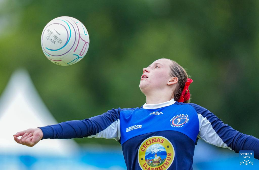 CHENGDU, 9 agosto, 2025 (Xinhua) -- Mikaela Dahling, de Chile, compite durante el partido del grupo B de la ronda preliminar femenina del evento de fistball entre Chile y Estados Unidos en los Juegos Mundiales 2025, en Chengdu, en la provincia de Sichuan, en el suroeste de China, el 9 de agosto de 2025. (Xinhua/Tenzin Nyida)