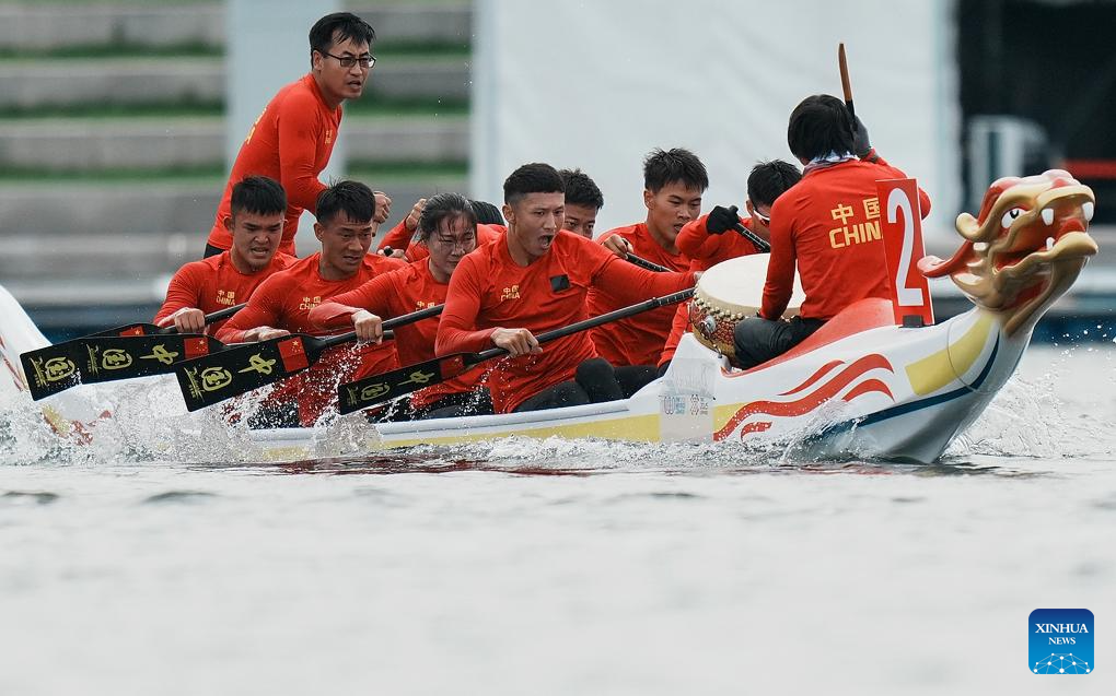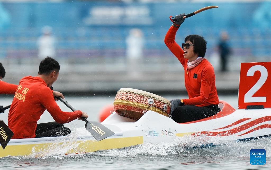 CHENGDU, 9 agosto, 2025 (Xinhua) -- El equipo de China compite durante la final de la carrera de persecución de 2000 m abierta de 8 plazas del evento de bote del dragón en los Juegos Mundiales 2025, en Chengdu, en la provincia de Sichuan, en el suroeste de China, el 9 de agosto de 2025. (Xinhua/Li Jianan)