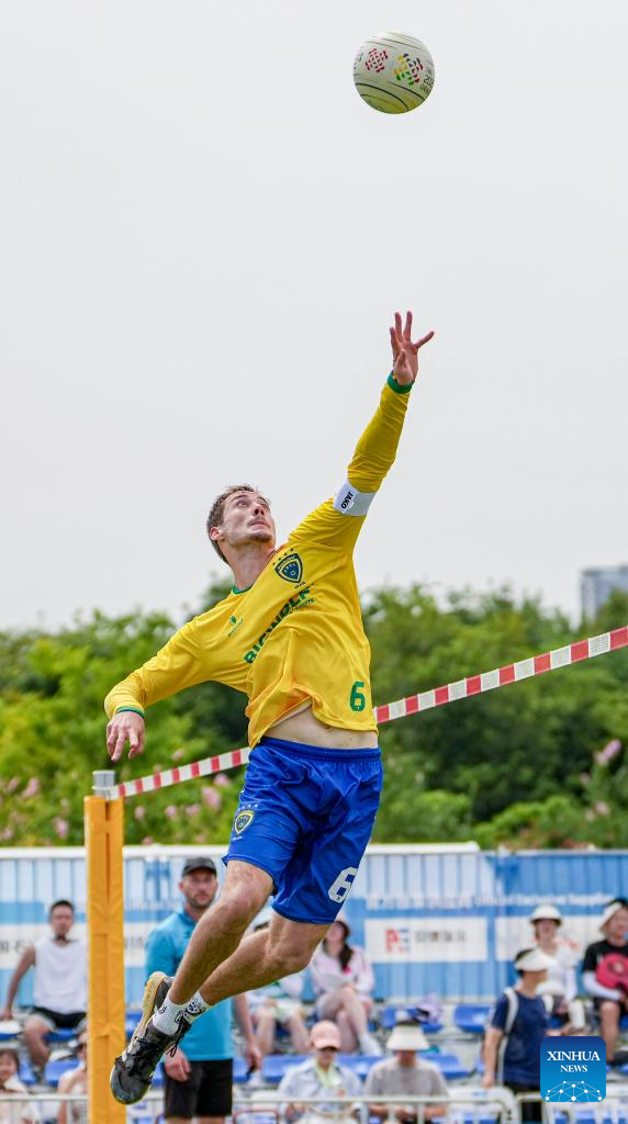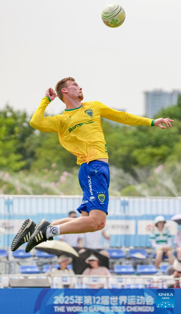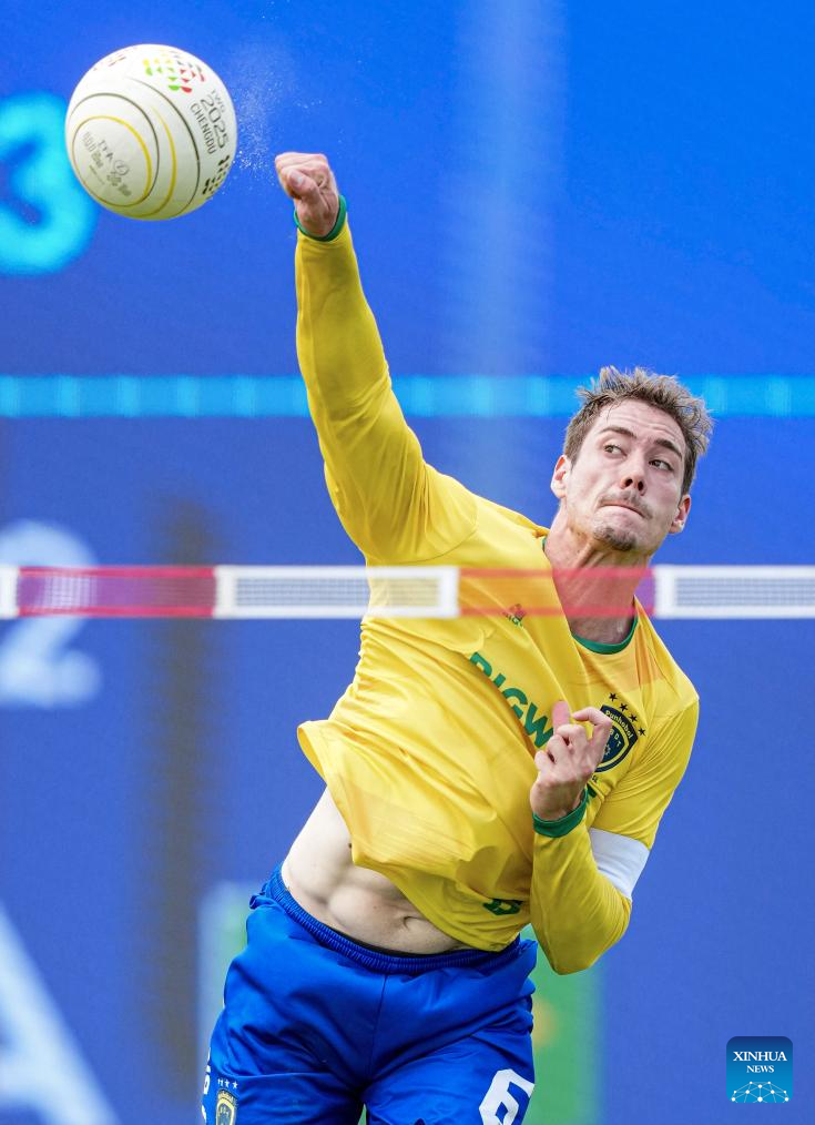 CHENGDU, 9 agosto, 2025 (Xinhua) -- Gabriel Petry Heck, de Brasil, compite durante el partido del grupo A de la ronda preliminar masculina del evento de fistball entre Alemania y Brasil en los Juegos Mundiales 2025, en Chengdu, en la provincia de Sichuan, en el suroeste de China, el 9 de agosto de 2025. (Xinhua/Tenzin Nyida)