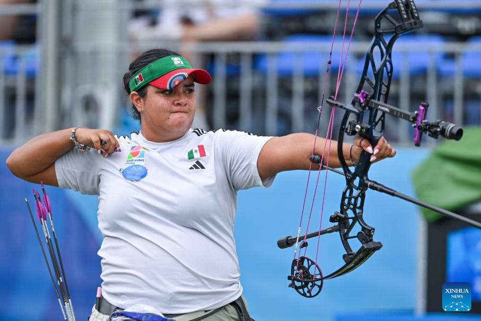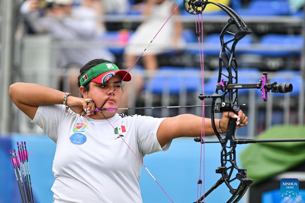 CHENGDU, 9 agosto, 2025 (Xinhua) -- Andrea Maya Becerra Arizaga, de México, compite ante Lisell Jaatma, de Estonia, durante el encuentro por la medalla de oro de compuesto femenino en el evento de tiro con arco en los Juegos Mundiales 2025, en Chengdu, en la provincia de Sichuan, en el suroeste de China, el 9 de agosto de 2025. (Xinhua/Chen Cheng)