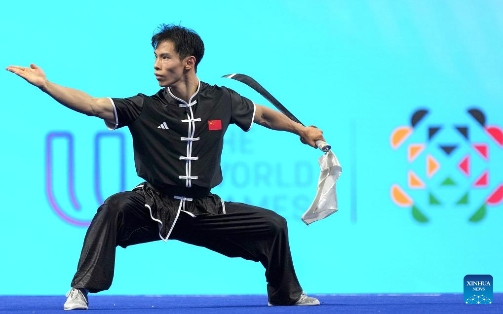 CHENGDU, 9 agosto, 2025 (Xinhua) -- Gao Jiushang, de China, compite durante la final de Changquan-Daoshu-Gunshu masculino del evento de Wushu en los Juegos Mundiales 2025, en Chengdu, en la provincia de Sichuan, en el suroeste de China, el 9 de agosto de 2025. (Xinhua/Xu Suhui)