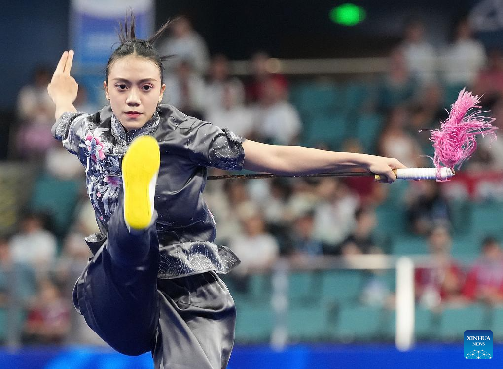 CHENGDU, 9 agosto, 2025 (Xinhua) -- Pang Pui Yee, de Malasia, compite durante la final de Changquan-Jianshu-Qiangshu femenino del evento de Wushu en los Juegos Mundiales 2025, en Chengdu, en la provincia de Sichuan, en el suroeste de China, el 9 de agosto de 2025. (Xinhua/Xu Suhui)