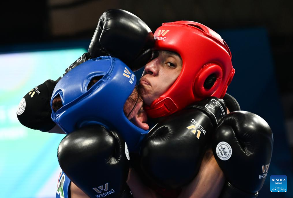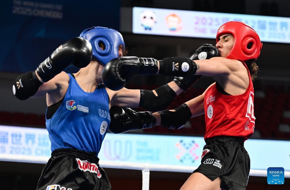 CHENGDU, 9 agosto, 2025 (Xinhua) -- Laura Fernanda Burgos López (d), de México, compite ante Monika Chochlikova, de Eslovaquia, durante las semifinales de -54 kg femeninas del evento de muay thai en los Juegos Mundiales 2025, en Chengdu, en la provincia de Sichuan, en el suroeste de China, el 9 de agosto de 2025. (Xinhua/Zhang Bowen)
