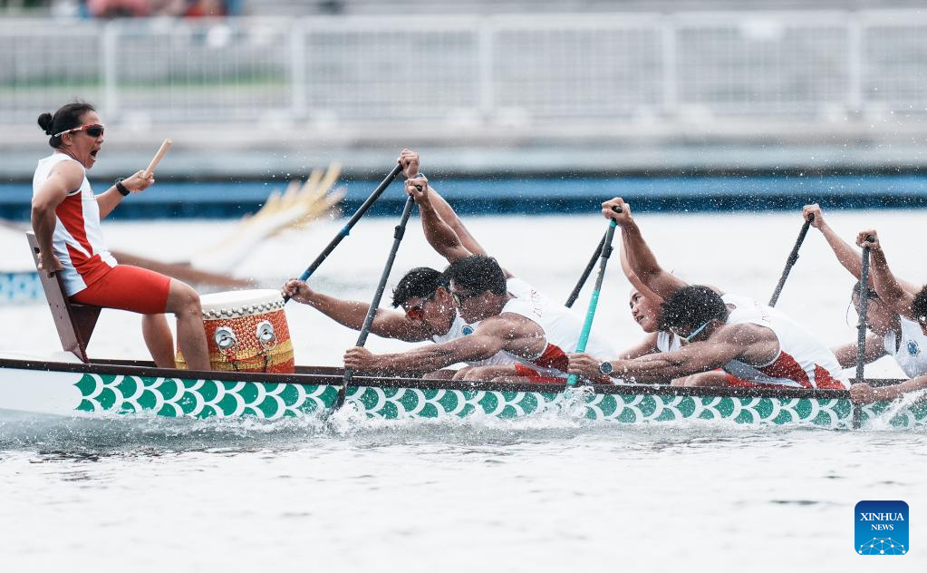 CHENGDU, 9 agosto, 2025 (Xinhua) -- El equipo de Indonesia compite durante la semifinal de 500 m de 10 plazas del evento de bote del dragón en los Juegos Mundiales 2025, en Chengdu, en la provincia de Sichuan, en el suroeste de China, el 9 de agosto de 2025. (Xinhua/Li Jianan)