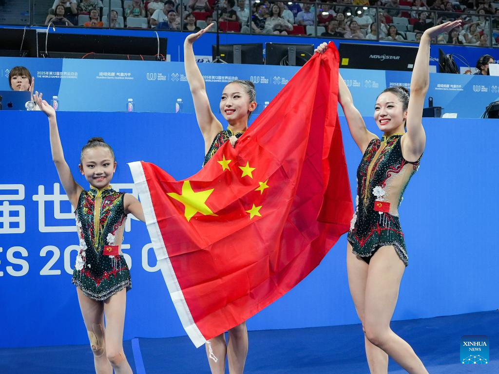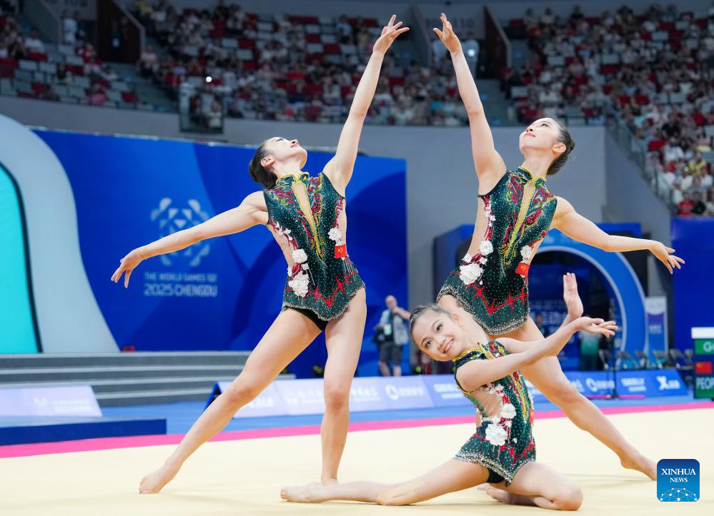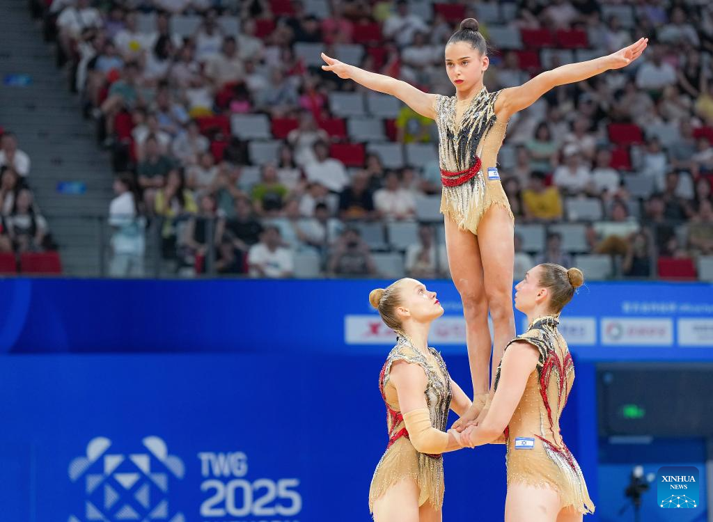 CHENGDU, 9 agosto, 2025 (Xinhua) -- El equipo de Israel compite durante la final de grupos femeninos del evento de gimnasia acrobática en los Juegos Mundiales 2025, en Chengdu, en la provincia de Sichuan, en el suroeste de China, el 9 de agosto de 2025. (Xinhua/Wang Xi)