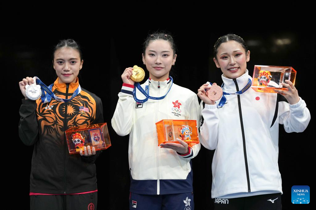 CHENGDU, 9 agosto, 2025 (Xinhua) -- La medallista de oro Sham Hui Yu Lydia (c), de Hong Kong de China, la medallista de plata Pang Pui Yee (i), de Malasia, y la medallista de bronce Kida Nanoha, de Japón, posan durante la ceremonia de premiación de Changquan-Jianshu-Qiangshu femenino del evento de Wushu en los Juegos Mundiales 2025, en Chengdu, en la provincia de Sichuan, en el suroeste de China, el 9 de agosto de 2025. (Xinhua/Xu Suhui)