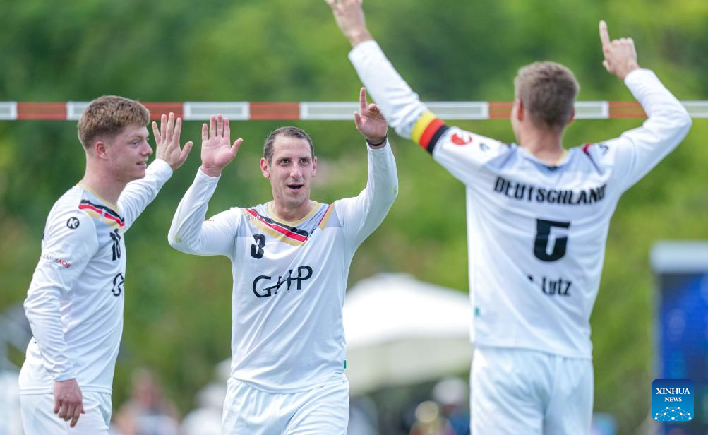 CHENGDU, 9 agosto, 2025 (Xinhua) -- Jugadores de Alemania festejan durante el partido del grupo A de la ronda preliminar masculina del evento de fistball entre Alemania y Brasil en los Juegos Mundiales 2025, en Chengdu, en la provincia de Sichuan, en el suroeste de China, el 9 de agosto de 2025. (Xinhua/Tenzin Nyida)
