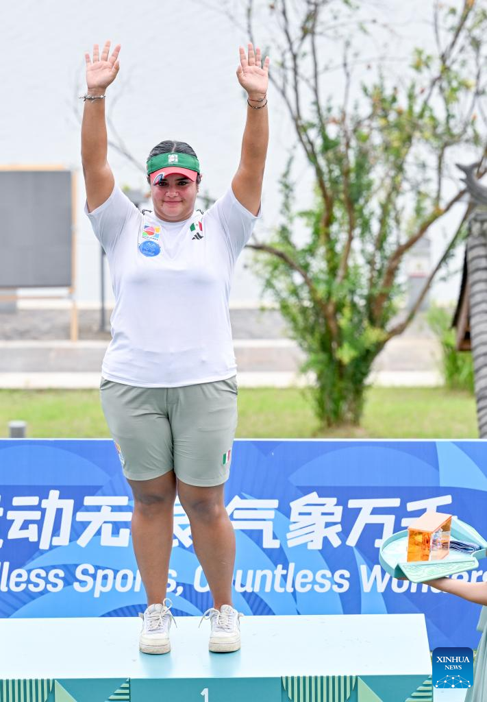 CHENGDU, 9 agosto, 2025 (Xinhua) -- La medallista de oro Andrea Maya Becerra Arizaga, de México, festeja durante la ceremonia de victoria de la competencia de compuesto femenino en el evento de tiro con arco en los Juegos Mundiales 2025, en Chengdu, en la provincia de Sichuan, en el suroeste de China, el 9 de agosto de 2025. (Xinhua/Chen Cheng)