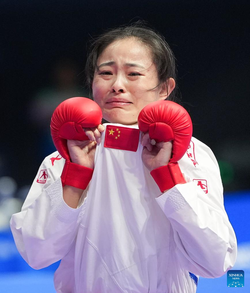 CHENGDU, 9 agosto, 2025 (Xinhua) -- Gong Li, de China, festeja después de ganar ante Shimada Sarara, de Japón, durante el combate por la medalla de oro de -61 kg de kumite femenino del evento de karate en los Juegos Mundiales 2025, en Chengdu, en la provincia de Sichuan, en el suroeste de China, el 9 de agosto de 2025. (Xinhua/Jiang Hongjing)