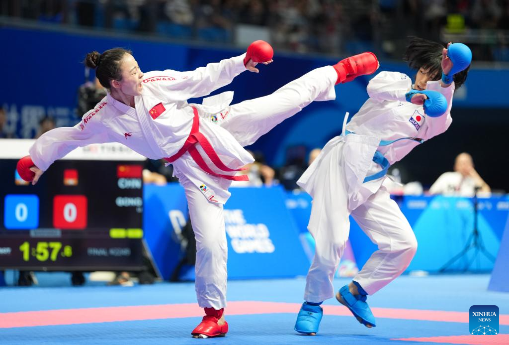 CHENGDU, 9 agosto, 2025 (Xinhua) -- Gong Li (i), de China, compite ante Shimada Sarara, de Japón, durante el combate por la medalla de oro de -61 kg de kumite femenino del evento de karate en los Juegos Mundiales 2025, en Chengdu, en la provincia de Sichuan, en el suroeste de China, el 9 de agosto de 2025. (Xinhua/Jiang Hongjing)