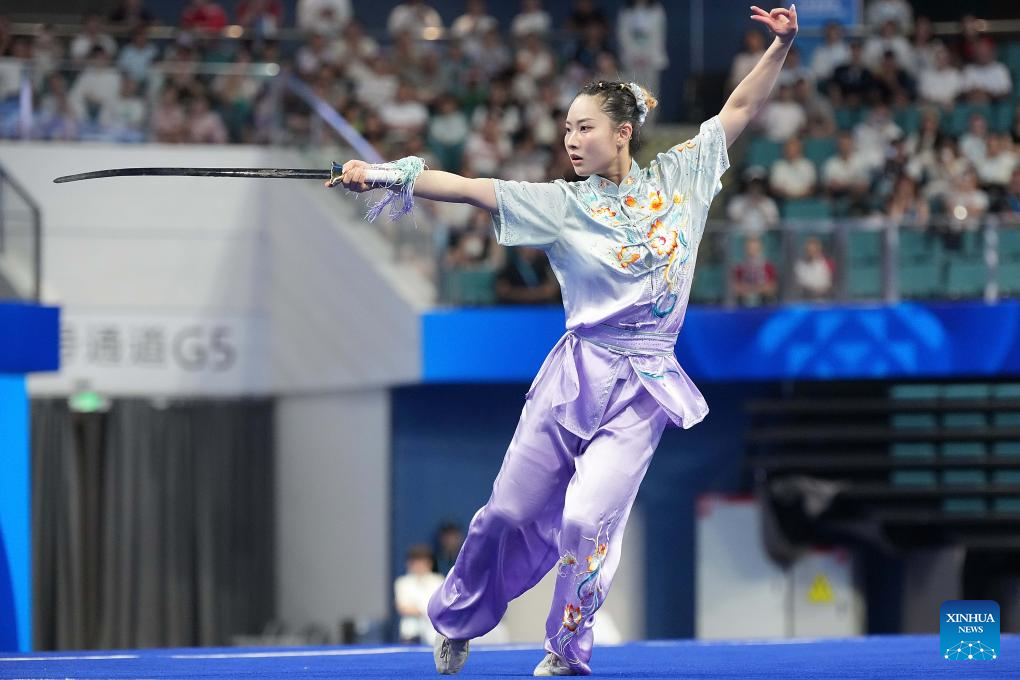 CHENGDU, 9 agosto, 2025 (Xinhua) -- Sham Hui Yu Lydia, de Hong Kong de China, compite durante la final de Changquan-Jianshu-Qiangshu femenino del evento de Wushu en los Juegos Mundiales 2025, en Chengdu, en la provincia de Sichuan, en el suroeste de China, el 9 de agosto de 2025. (Xinhua/Xu Suhui)