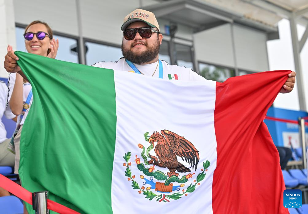 CHENGDU, 9 agosto, 2025 (Xinhua) -- Un simpatizante de la medallista de oro Andrea Maya Becerra Arizaga, de México, anima al término del encuentro por la medalla de oro de compuesto femenino en el evento de tiro con arco en los Juegos Mundiales 2025, en Chengdu, en la provincia de Sichuan, en el suroeste de China, el 9 de agosto de 2025. (Xinhua/Chen Cheng)