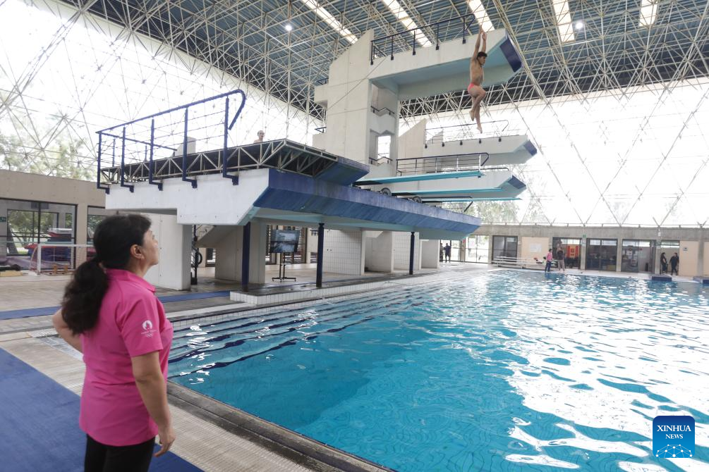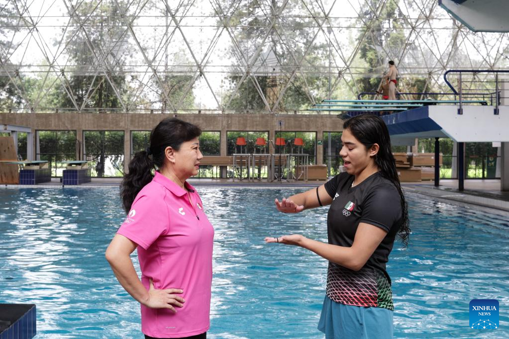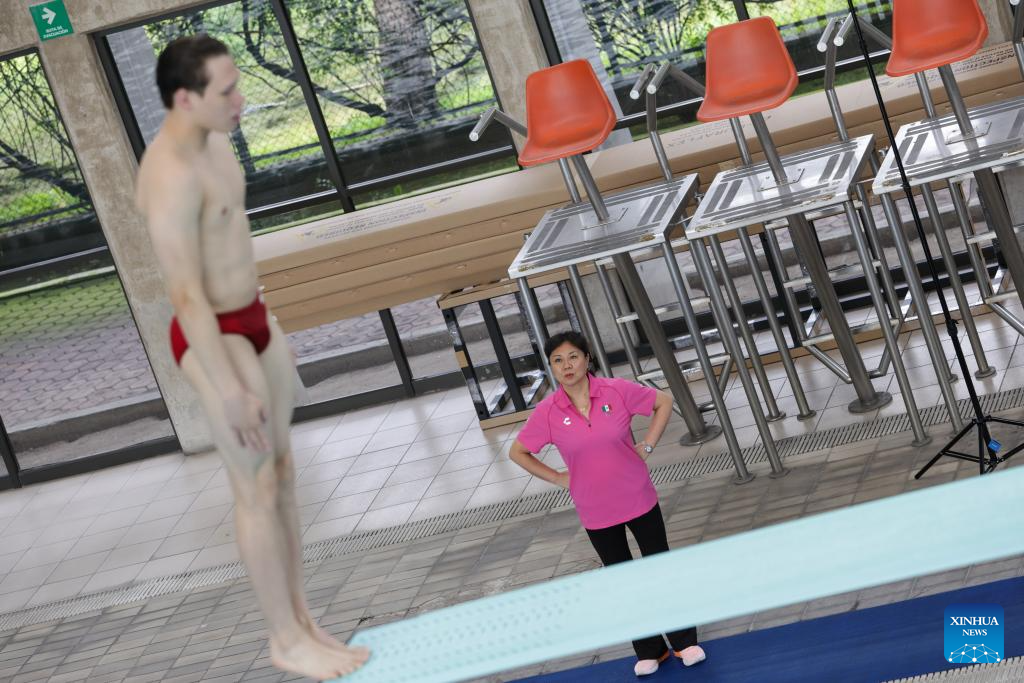 CIUDAD DE MEXICO, 9 agosto, 2025 (Xinhua) -- Imagen del 8 de agosto de 2025 de la entrenadora china, Ma Jin (atrás), dando indicaciones al clavadista mexicano, Joaquín Rosado (frente), durante un entrenamiento de integrantes de la selección nacional de clavados llevado a cabo en el Centro Nacional de Desarrollo de Talentos Deportivos y Alto Rendimiento, en la Ciudad de México, capital de México. (Xinhua/Francisco Cañedo)
