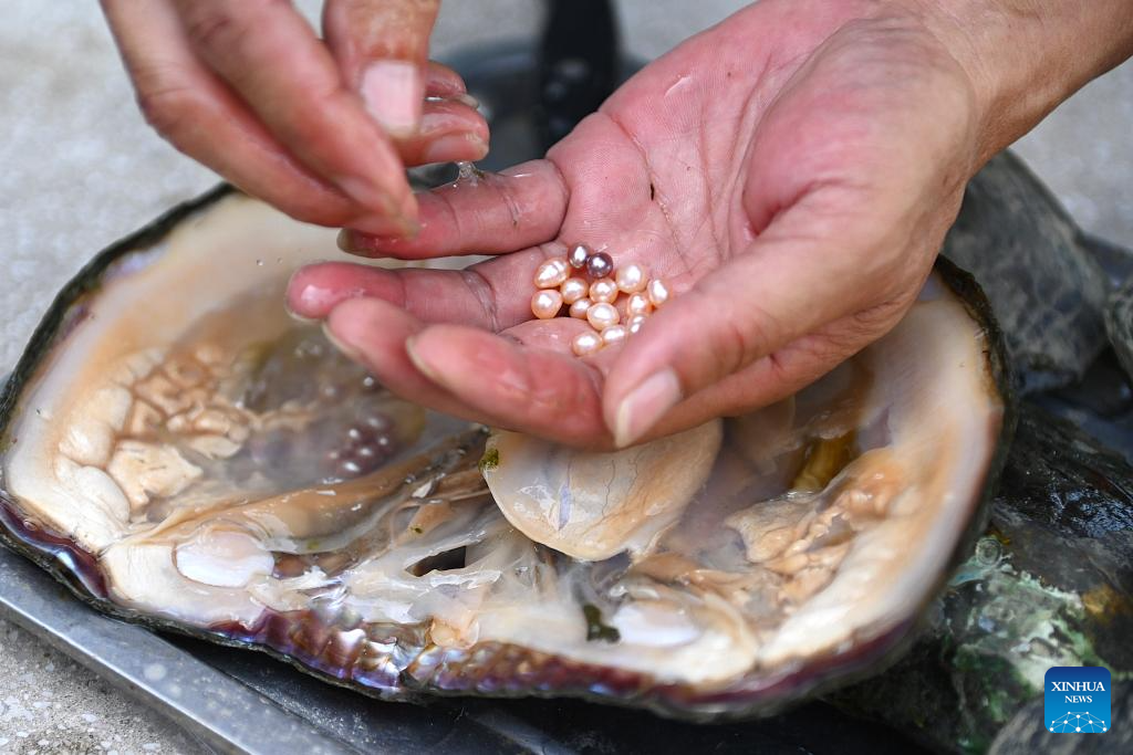 ZHUJI, 10 agosto, 2025 (Xinhua) -- Imagen del 9 de agosto de 2025 de una trabajadora abriendo un mejillón para extraer perlas, en el poblado de Shanxiahu de la ciudad de Zhuji, en la provincia de Zhejiang, en el este de China. El poblado de Shanxiahu de la provincia de Zhejiang es famoso por su industria de perlas que abarca desde el cultivo, el procesamiento y el comercio de perlas hasta el turismo cultural. Shanxiahu ha adoptado innovaciones tecnológicas en los últimos años para impulsar el cultivo ecológico de perlas y el desarrollo sostenible. Este poblado es ahora un importante centro comercial de perlas y una plataforma de comercio de joyas en línea en China, que gestiona el 80 por ciento del volumen comercial de perlas del país, y el negocio de la "economía de la belleza" también ha mejorado considerablemente los ingresos de los hogares de la zona. (Xinhua/Mao Zhu)