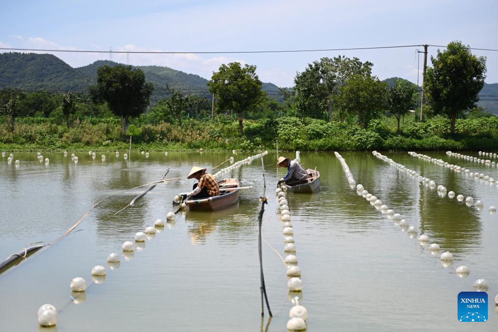 ZHUJI, 10 agosto, 2025 (Xinhua) -- Imagen del 9 de agosto de 2025 de trabajadores liberando mejillones en una base de cultivo inteligente de perlas, en el poblado de Shanxiahu de la ciudad de Zhuji, en la provincia de Zhejiang, en el este de China. El poblado de Shanxiahu de la provincia de Zhejiang es famoso por su industria de perlas que abarca desde el cultivo, el procesamiento y el comercio de perlas hasta el turismo cultural. Shanxiahu ha adoptado innovaciones tecnológicas en los últimos años para impulsar el cultivo ecológico de perlas y el desarrollo sostenible. Este poblado es ahora un importante centro comercial de perlas y una plataforma de comercio de joyas en línea en China, que gestiona el 80 por ciento del volumen comercial de perlas del país, y el negocio de la "economía de la belleza" también ha mejorado considerablemente los ingresos de los hogares de la zona. (Xinhua/Mao Zhu)