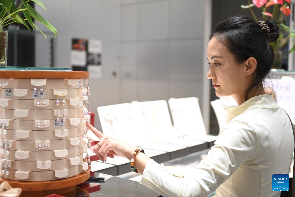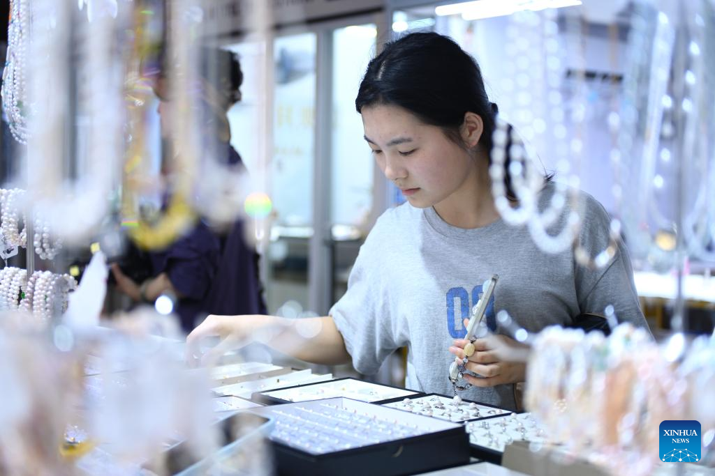 ZHUJI, 10 agosto, 2025 (Xinhua) -- Imagen del 9 de agosto de 2025 de una clienta seleccionando joyas de perlas en un centro comercial de productos de joyería, en el poblado de Shanxiahu de la ciudad de Zhuji, en la provincia de Zhejiang, en el este de China. El poblado de Shanxiahu de la provincia de Zhejiang es famoso por su industria de perlas que abarca desde el cultivo, el procesamiento y el comercio de perlas hasta el turismo cultural. Shanxiahu ha adoptado innovaciones tecnológicas en los últimos años para impulsar el cultivo ecológico de perlas y el desarrollo sostenible. Este poblado es ahora un importante centro comercial de perlas y una plataforma de comercio de joyas en línea en China, que gestiona el 80 por ciento del volumen comercial de perlas del país, y el negocio de la "economía de la belleza" también ha mejorado considerablemente los ingresos de los hogares de la zona. (Xinhua/Mao Zhu)