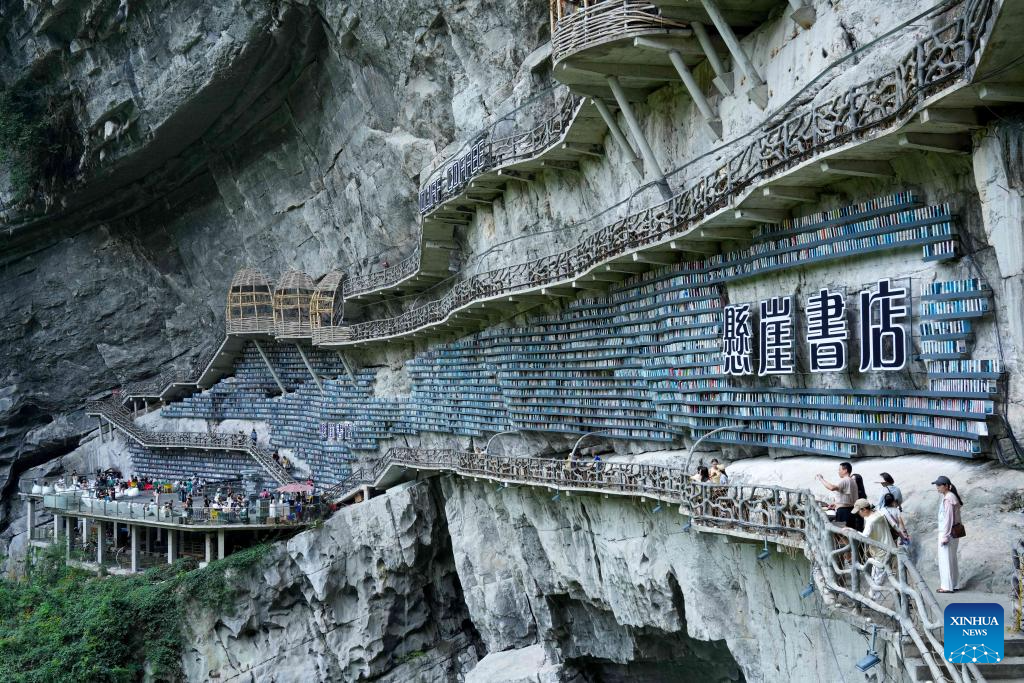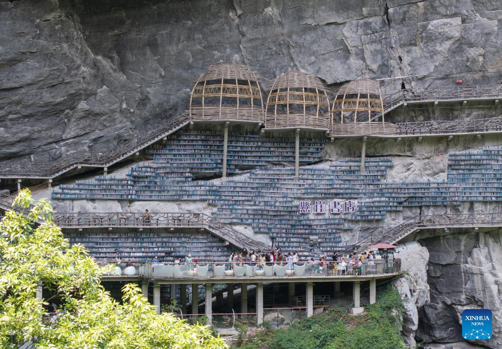 LIUZHOU, 10 agosto, 2025 (Xinhua) -- Imagen del 9 de agosto de 2025 de personas visitando una librería en el acantilado en un punto escénico, en el distrito autónomo mulao de Luocheng, en la ciudad de Hechi, en la región autónoma zhuang de Guangxi, en el sur de China. La librería en el acantilado fue inaugurada en mayo de este año y ha registrado 100.000 visitas hasta ahora por su diseño arquitectónico único y experiencia de lectura. (Xinhua/Long Tao)