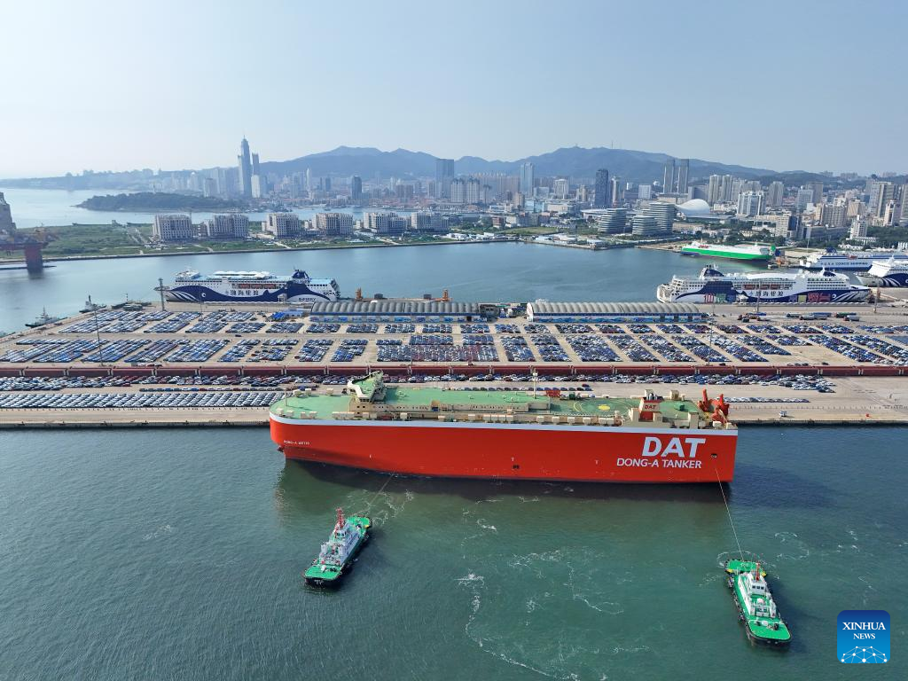 Imagen tomada con un dron el 5 de agosto de 2025 de un ferry de carga abarrotado con automóviles para exportación saliendo del puerto de Yantai, en la provincia de Shandong, en el este de China. La industria de automóvil de China experimentó un sólido crecimiento interanual tanto en producción como en ventas en julio, según datos de la industria publicados el lunes. (Xinhua/Tang Ke)