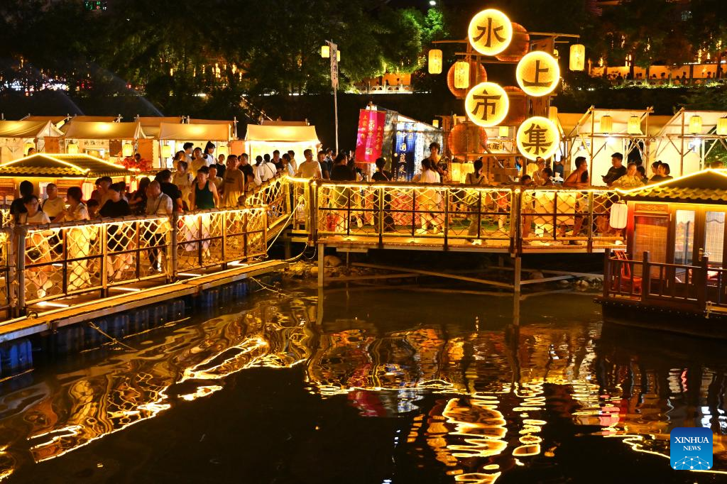 ENSHI, 10 agosto, 2025 (Xinhua) -- Imagen del 9 de agosto de 2025 de personas visitando un mercado acuático cerca del río Gongshui, en el distrito de Xuan'en, en la prefectura autónoma tujia y miao de Enshi, en la provincia de Hubei, en el centro de China. El mercado acuático abrió sus puertas al público el sábado por la tarde. (Xinhua/Song Wen)