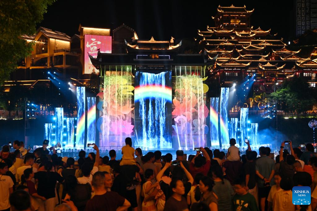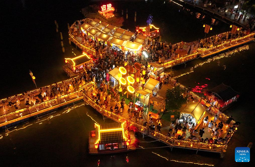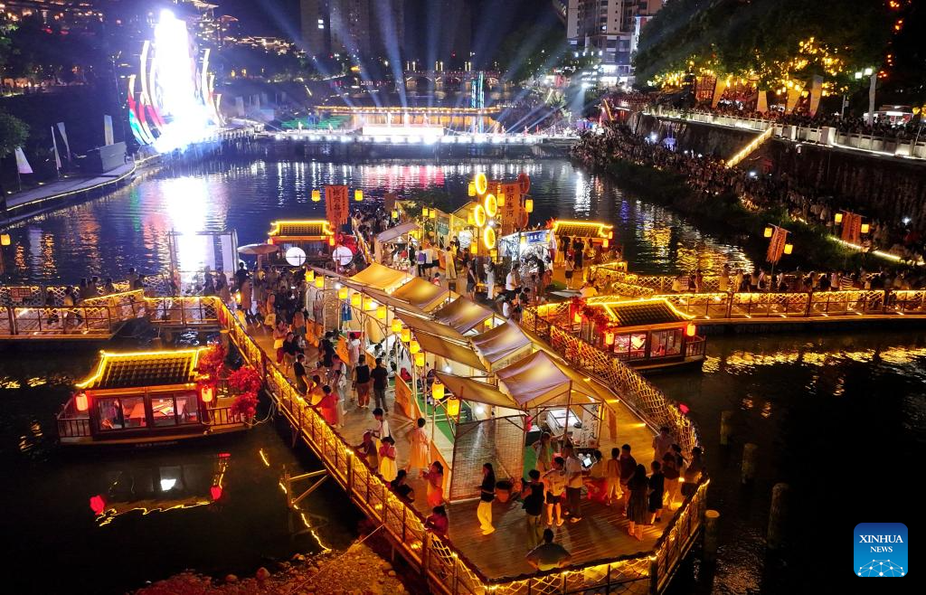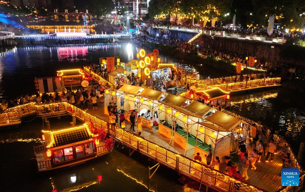 ENSHI, 10 agosto, 2025 (Xinhua) -- Imagen del 9 de agosto de 2025 de personas visitando un mercado acuático en el río Gongshui, en el distrito de Xuan'en, en la prefectura autónoma tujia y miao de Enshi, en la provincia de Hubei, en el centro de China. El mercado acuático abrió sus puertas al público el sábado por la tarde. (Xinhua/Song Wen)