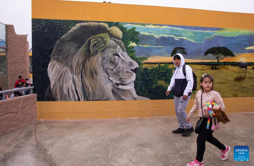 Imagen del 9 de agosto de 2025 de personas caminando frente a un mural de un león en el zoológico Parque de Las Leyendas en el marco de la celebración del Día Mundial del León, en Lima, Perú. La protección del león, especie considerada vulnerable a nivel global, requiere del compromiso y la conciencia de todos para su preservación, afirmó el domingo el jefe del Area de Manejo y Bienestar del Parque de las Leyendas de Perú, Carlos Párraga. (Xinhua/Mariana Bazo)