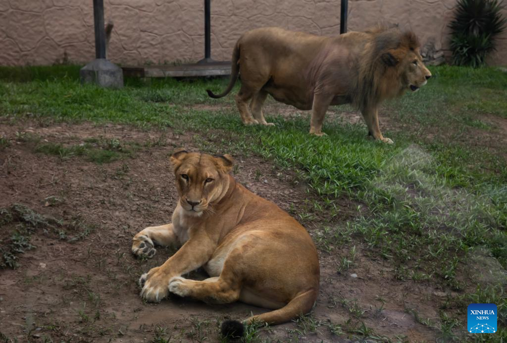 Imagen del 9 de agosto de 2025 del león Sultán (d) caminando y la leona Chiclayanita (i) descansando en su recinto del zoológico Parque de Las Leyendas, en el marco de la celebración del Día Mundial del León, en Lima, Perú. La protección del león, especie considerada vulnerable a nivel global, requiere del compromiso y la conciencia de todos para su preservación, afirmó el domingo el jefe del Area de Manejo y Bienestar del Parque de las Leyendas de Perú, Carlos Párraga. (Xinhua/Mariana Bazo)