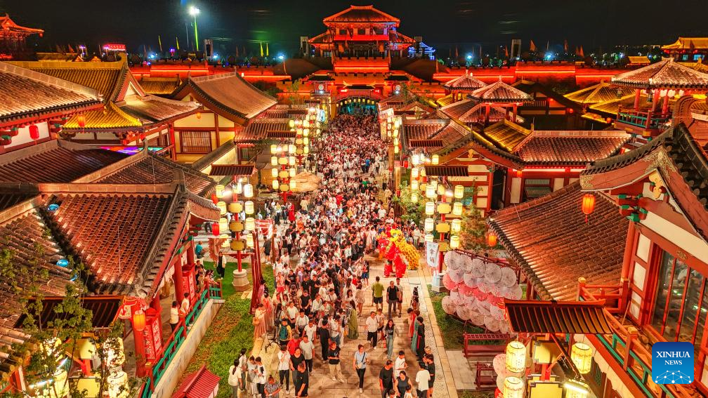 BEIJING, 11 agosto, 2025 (Xinhua) -- Imagen tomada con un dron el 9 de agosto de 2025 de turistas visitando un punto escénico en la noche, en la ciudad de Leling, en la provincia de Shandong, en el este de China. Las áreas escénicas a lo largo de China han entrado a la temporada alta de turismo durante las vacaciones de verano. (Xinhua/Jia Peng)