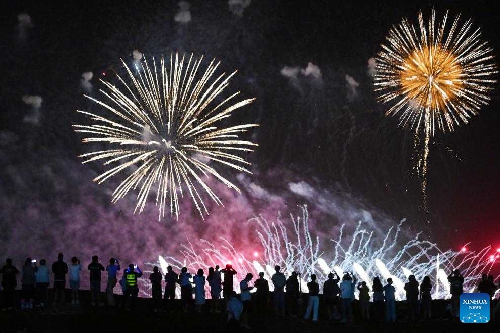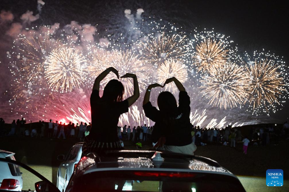 BEIJING, 11 agosto, 2025 (Xinhua) -- Imagen del 10 de agosto de 2025 de turistas observando un espectáculo de fuegos artificiales, en el distrito de Shapotou de Zhongwei, en la región autónoma hui de Ningxia, en el noroeste de China. Las áreas escénicas a lo largo de China han entrado a la temporada alta de turismo durante las vacaciones de verano. (Xinhua/Yuan Hongyan)