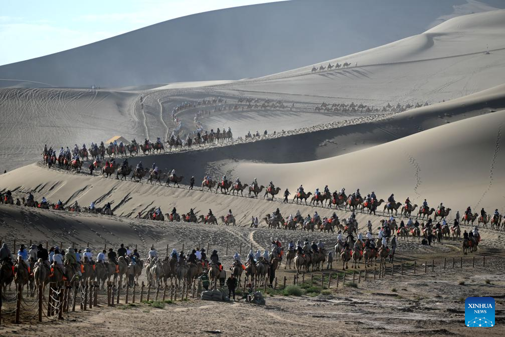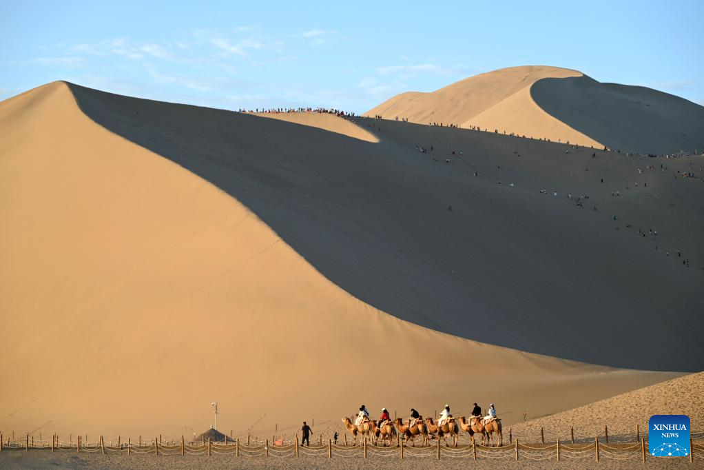 BEIJING, 11 agosto, 2025 (Xinhua) -- Imagen del 9 de agosto de 2025 de turistas visitando el punto escénico de la Montaña Mingsha y el Manantial de la Luna Creciente, en la ciudad de Dunhuang, en la provincia de Gansu, en el noroeste de China. Las áreas escénicas a lo largo de China han entrado a la temporada alta de turismo durante las vacaciones de verano. (Xinhua/Zhang Xiaoliang)