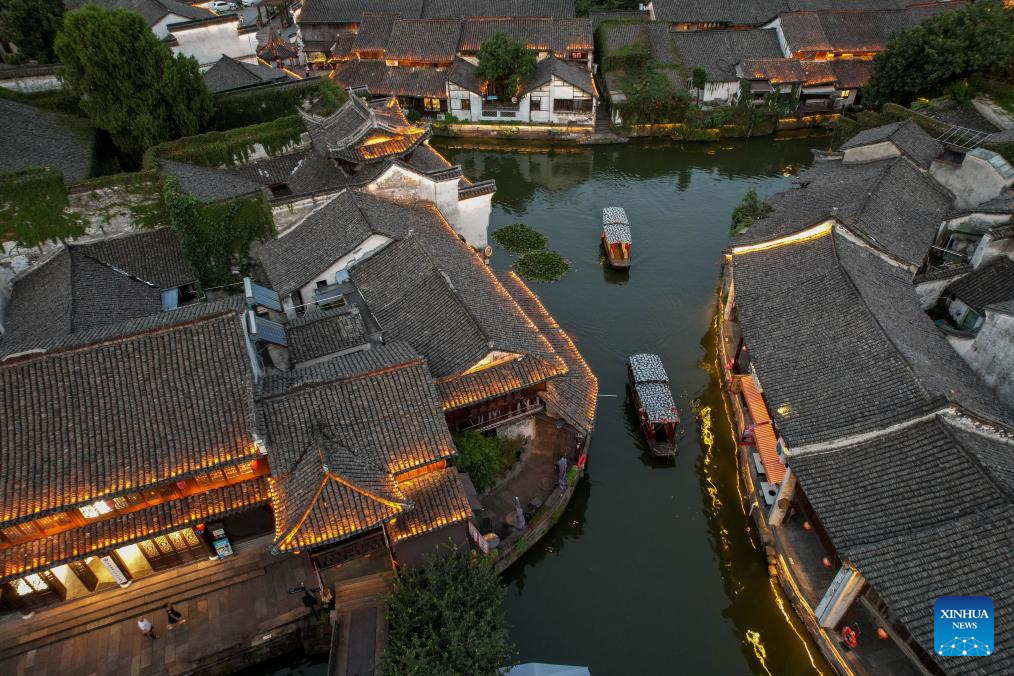 BEIJING, 11 agosto, 2025 (Xinhua) -- Vista aérea tomada con un dron el 9 de agosto de 2025 del paisaje nocturno de la ciudad antigua de Xinshi, en el distrito de Deqing, en la provincia de Zhejiang, en el este de China. Las áreas escénicas a lo largo de China han entrado a la temporada alta de turismo durante las vacaciones de verano. (Xinhua/Yao Haixiang)