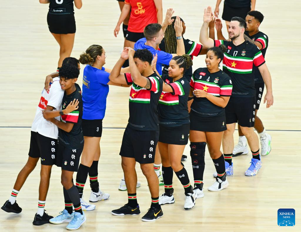 CHENGDU, 11 agosto, 2025 (Xinhua) -- Jugadores de Surinam festejan al término del partido de semifinal de consolación 5-8 por equipos mixtos de Korfball entre China y Surinam, en los Juegos Mundiales 2025, en Chengdu, en la provincia de Sichuan, en el suroeste de China, el 11 de agosto de 2025. (Xinhua/Jiang Kehong)