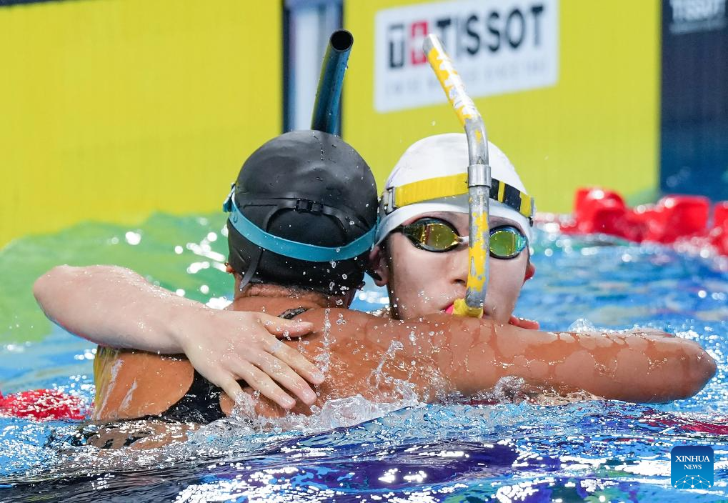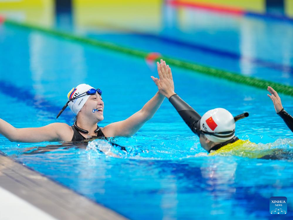 CHENGDU, 11 agosto, 2025 (Xinhua) -- Hu Yaoyao (d), del equipo de China, abraza a Diana Paola Moreno Alegría, del equipo de Colombia, al término de la final femenina de relevos en superficie 4x50 m del evento de natación con aletas en los Juegos Mundiales 2025, celebrados en Chengdu, provincia de Sichuan, suroeste de China, el 11 de agosto de 2025. (Xinhua/Zhang Liyun)