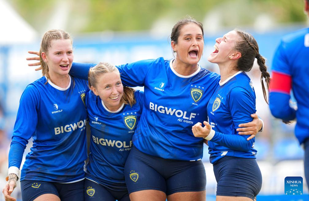 CHENGDU, 11 agosto, 2025 (Xinhua) -- El equipo de Brasil festeja una anotación durante el partido del Grupo B de la ronda preliminar femenina de fistball entre Brasil y Alemania en los Juegos Mundiales 2025, en Chengdu, en la provincia de Sichuan, en el suroeste de China, el 11 de agosto de 2025. (Xinhua/Tenzin Nyida)