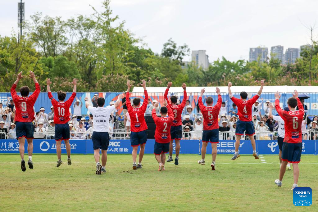 CHENGDU,11 agosto, 2025 (Xinhua) -- Jugadores de Chile saludan a los espectadores al término del partido del Grupo B de la ronda preliminar masculina de fistball entre Chile y Argentina en los Juegos Mundiales 2025, en Chengdu, en la provincia de Sichuan, en el suroeste de China, el 11 de agosto de 2025. (Xinhua/Wang Xiang)